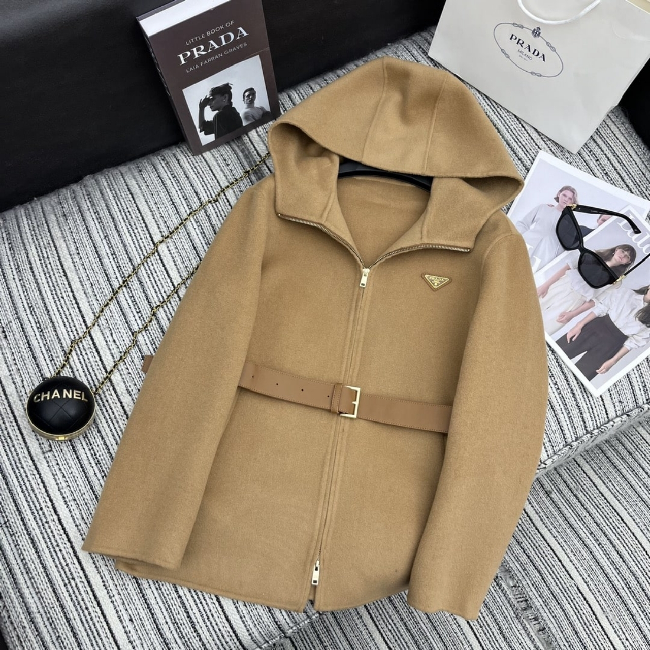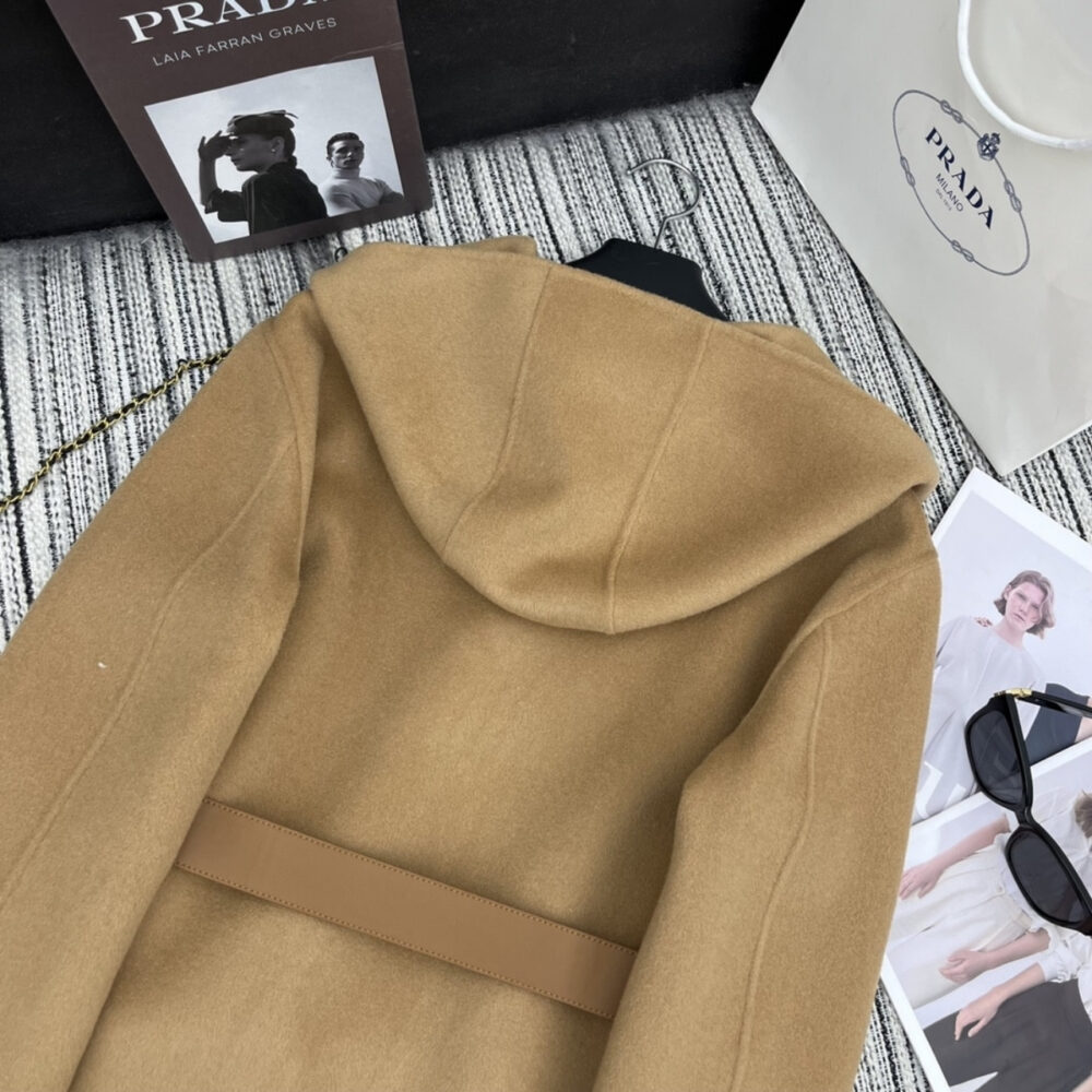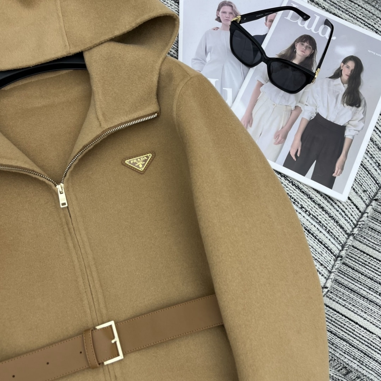 Replica 1:1 – Prada Wool Coat With Hood And Leather Belt Brown