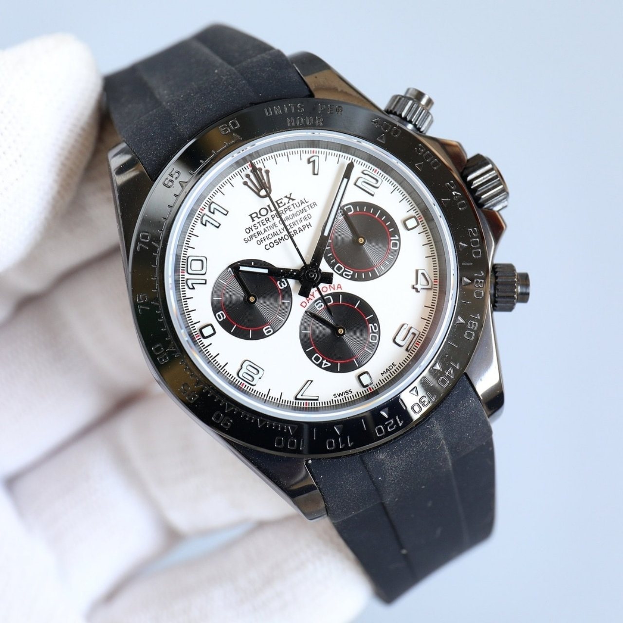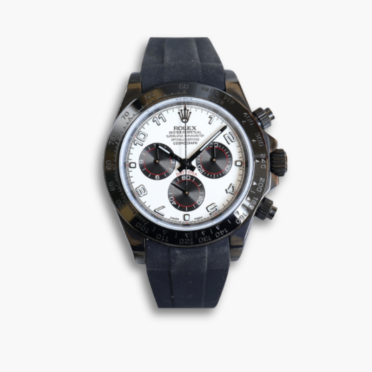 This stunning timepiece features a bold, all-black case and rubber strap beautifully contrasting with a crisp white dial, giving it a modern and aggressive edge. The iconic Rolex Daytona configuration is accented by black sub-dials, making this modified luxury watch a truly attractive and eye-catching statement piece.
