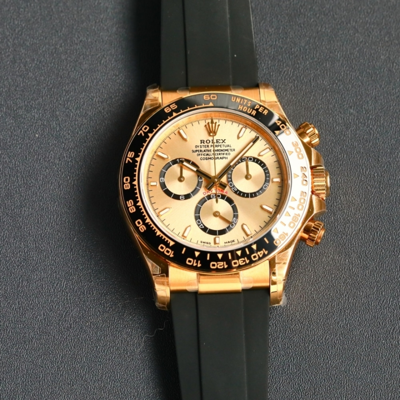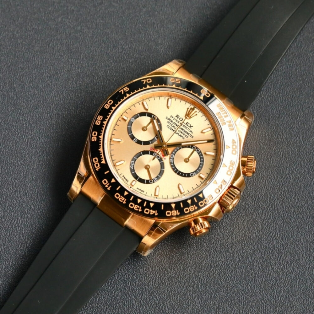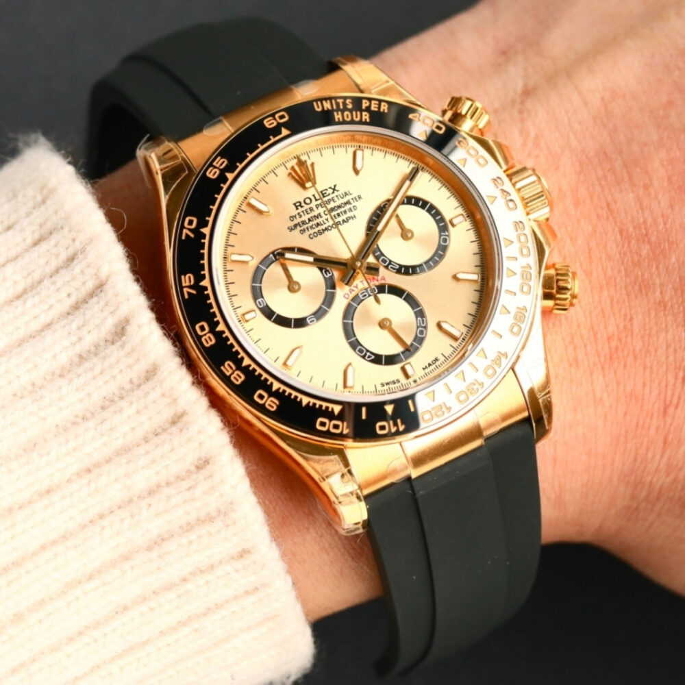 This is the stunning Rolex Cosmograph Daytona in gold, featuring a striking golden dial and a contrasting black Cerachrom bezel. Its luxurious combination of precious metal and sporty black Oysterflex bracelet makes it an irresistibly attractive and highly sought-after chronograph.