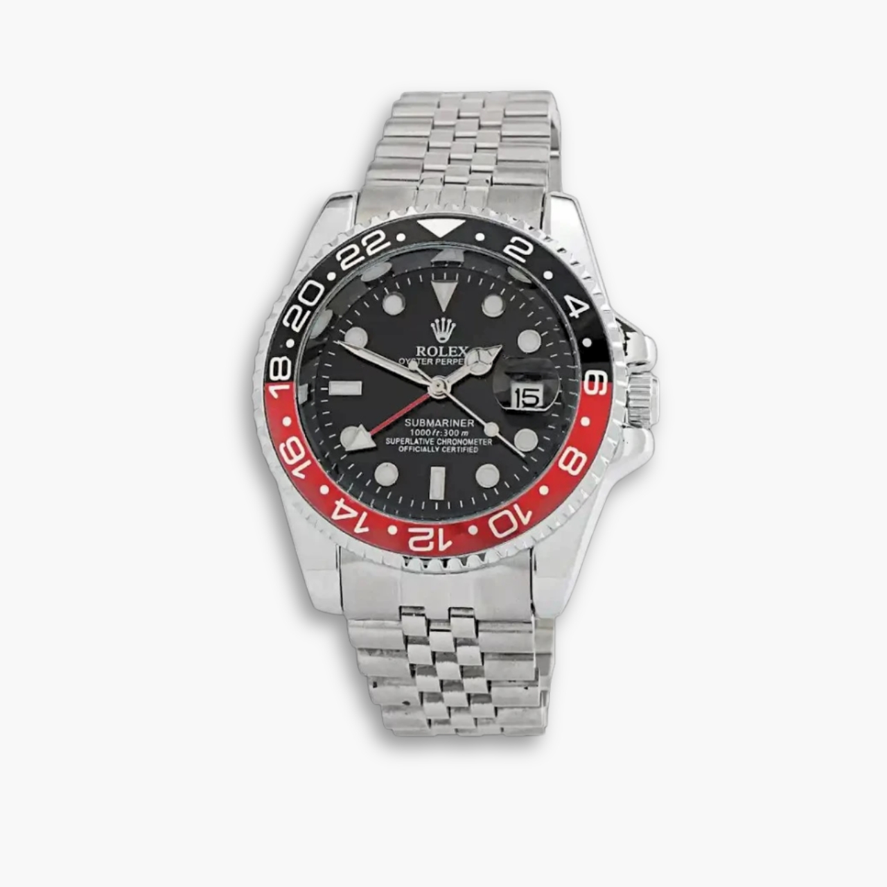 This showcases an eye-catching timepiece featuring a striking black and red bezel, reminiscent of the famous “Coke” color scheme. The watch is presented on an elegant Jubilee bracelet, suggesting a blend of sporty functionality and sophisticated style perfect for travel and daily wear.