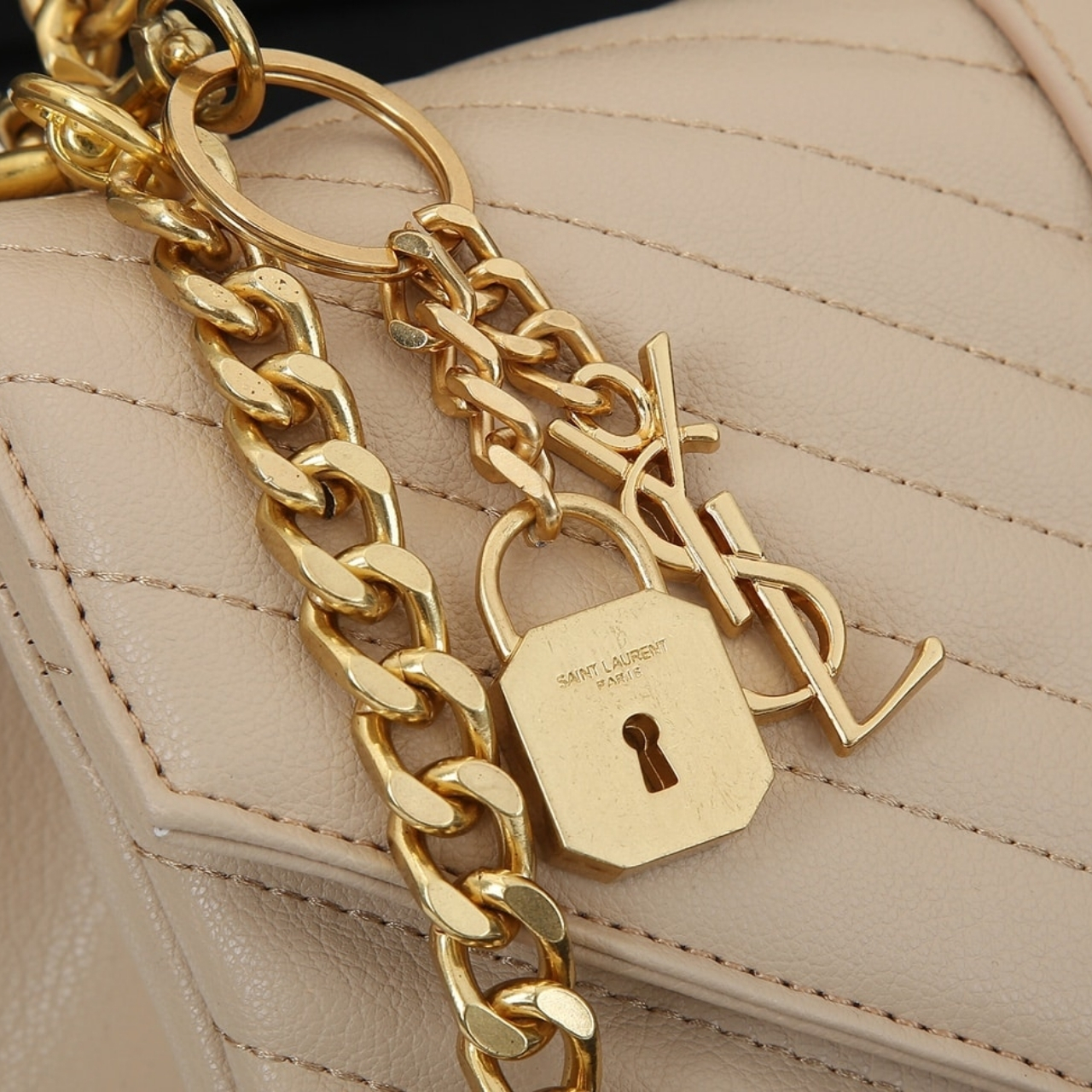 The Saint Laurent College Medium Bag in Beige captures timeless Parisian elegance with a modern twist. It features the iconic YSL logo and luxe gold hardware that add instant sophistication. Its versatile top handle and chain strap make it perfect for both day and evening chic.