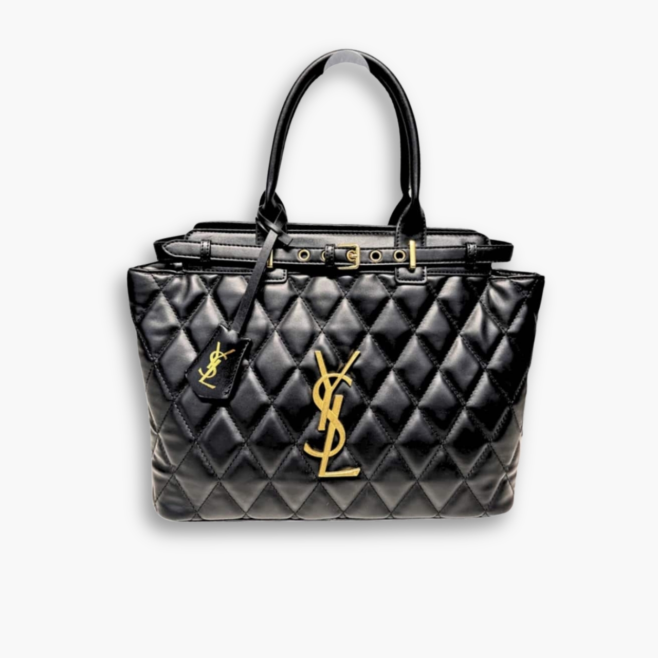 This is the Saint Laurent Bag in Black with shining bronze-tone Hardware. It features Saint Laurent’s signature oversized YSL monogram at the front, a diamond-quilted pattern, top handles, and a detachable YSL tag. The bag’s soft, voluminous silhouette combines luxury and practicality — perfect for both daily wear and travel.