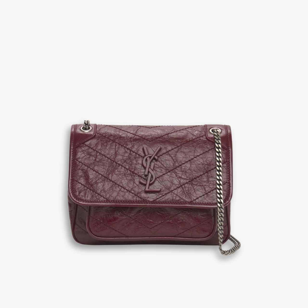 The Saint Laurent Niki in burgundy is an elegant 28cm bag made from leather, featuring stylish chevron quilt overstitching and an encased Cassandre. With two spacious compartments and a large back slot pocket, it also offers a versatile sliding chain strap for shoulder or crossbody wear.
