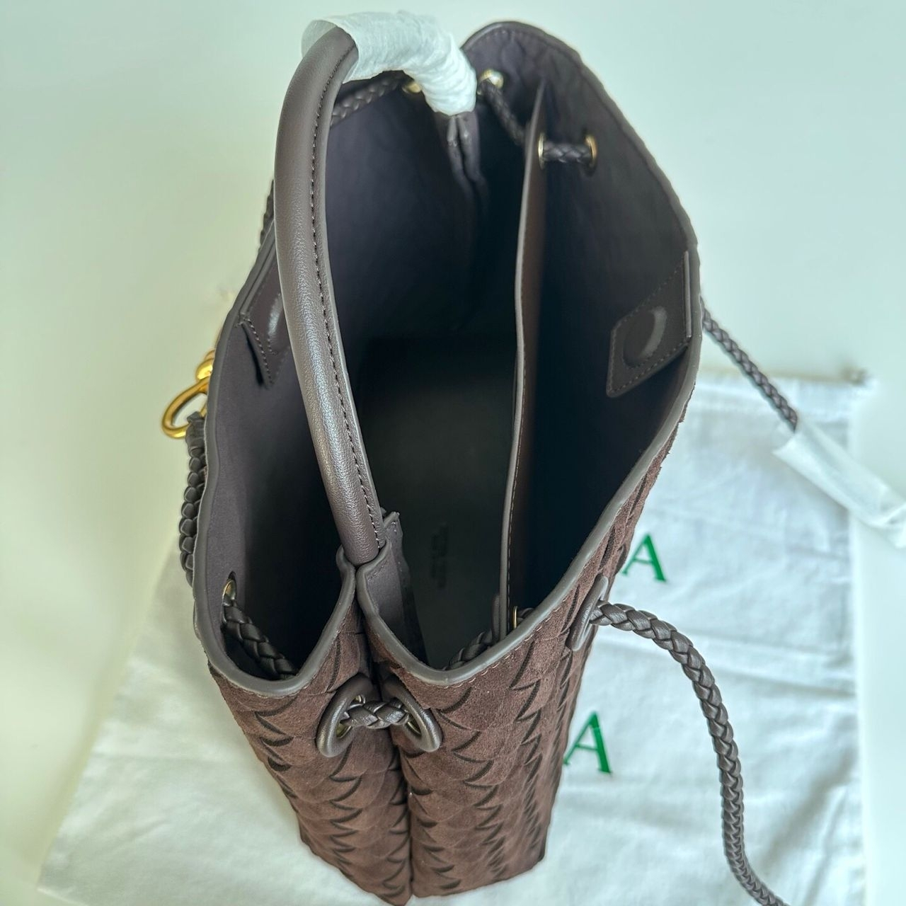 The Bottega Veneta Andiamo Fondant is top handle bag in supple Intrecciato suede with signature knot detail and sliding cross-body strap.