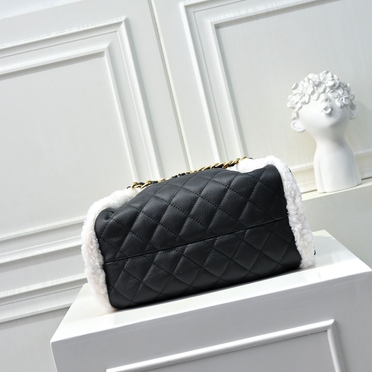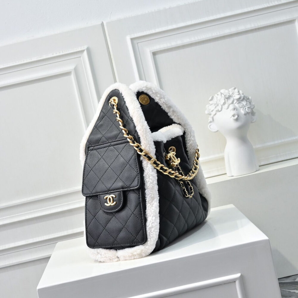 An elevated reinterpretation of Chanel’s timeless quilted design, this drawstring tote is crafted in supple black, trimmed luxuriously with a cozy yet refined touch. Side flap pockets add function without compromising elegance, making this tote both practical and irresistibly chic.