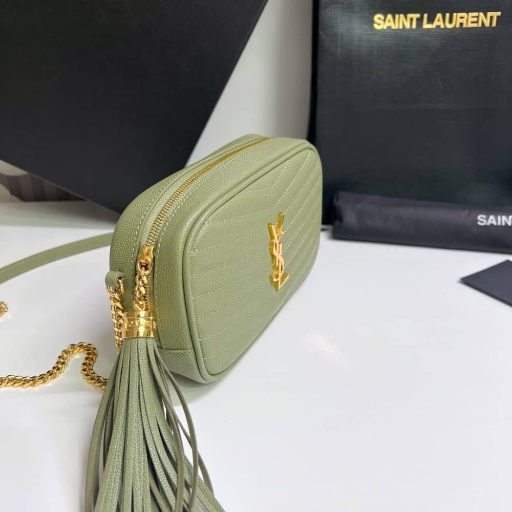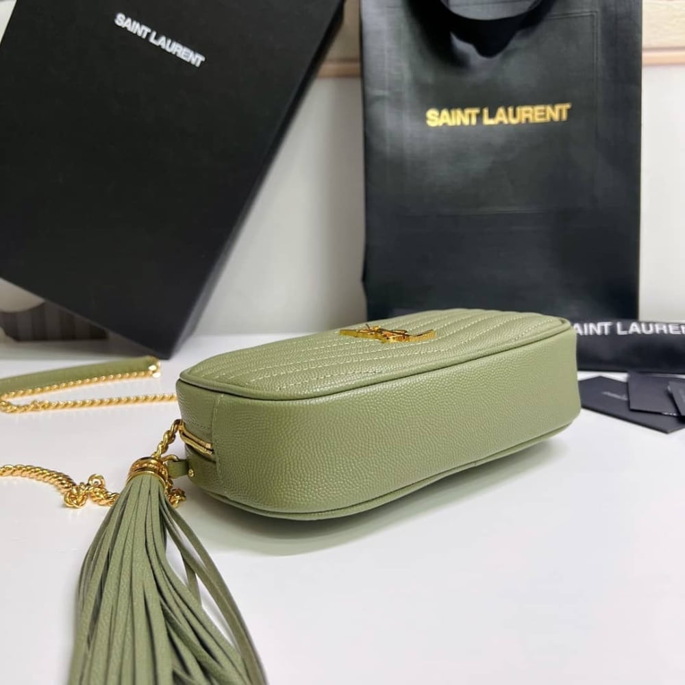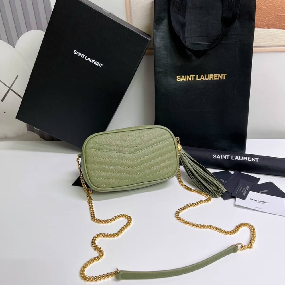 The Saint Laurent Mini Lou Camera Bag in Pistache 19cm is with the iconic YSL Cassandre logo. It features a top zip closure with a playful leather tassel and an adjustable crossbody strap for versatile styling. Compact yet chic, this bag is perfect for carrying your daily essentials with elegance.